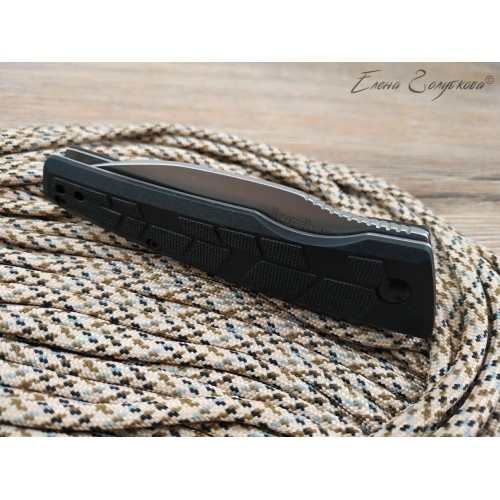 Рукоять собрана на стальных лайнерах и имеет накладки из FRN (нейлон, армированный стекловолокном), который может выдерживать высокие температурные нагрузки, обладает высокой ударной прочностью, диэлектрическими свойствами, практически не горит.. Рукоять имеет объемный рисунок, который позволяет руке не скользить во время работы ножом.