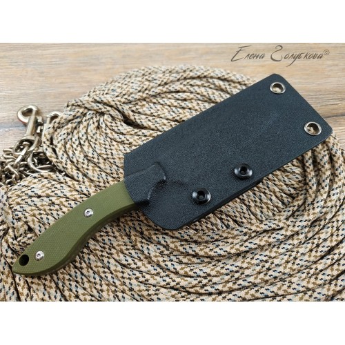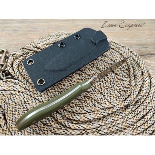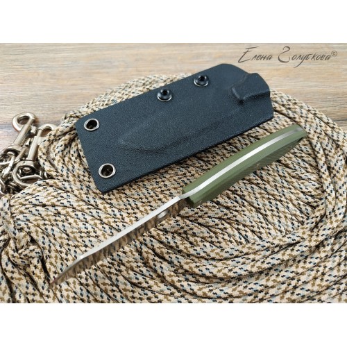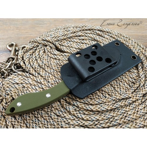 В комплекте ножны из пластика, нож крепко удерживается устьем. Для подвеса на ремень используется пластиковая скоба - клипса. Можно снять клипсу и подвесить нож за ножны на цепочку или шнур для ношения на груди, вниз рукоятью.