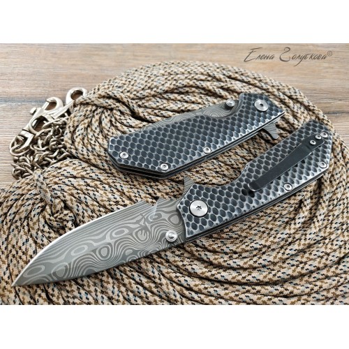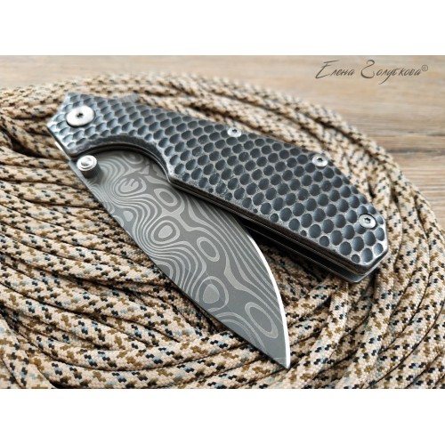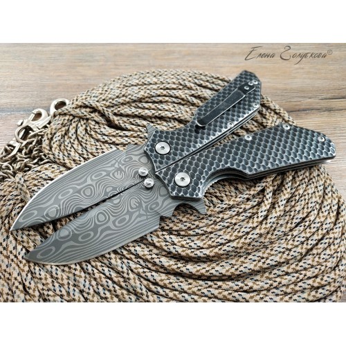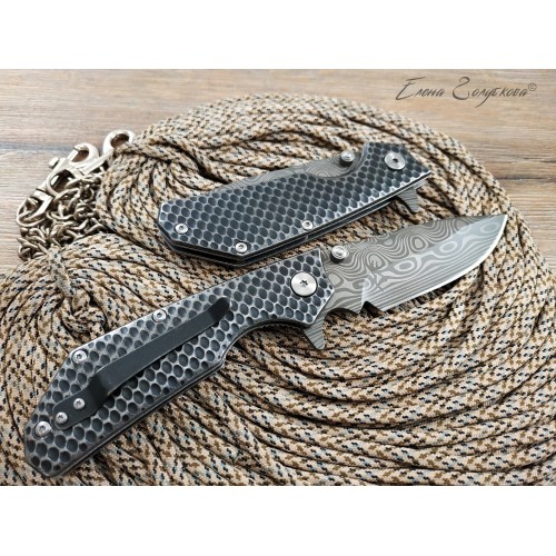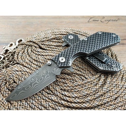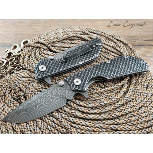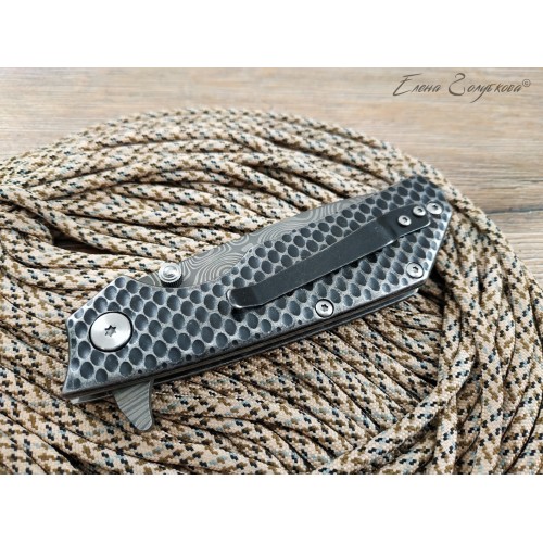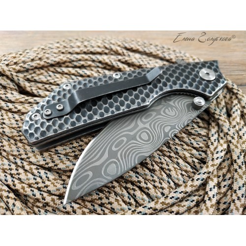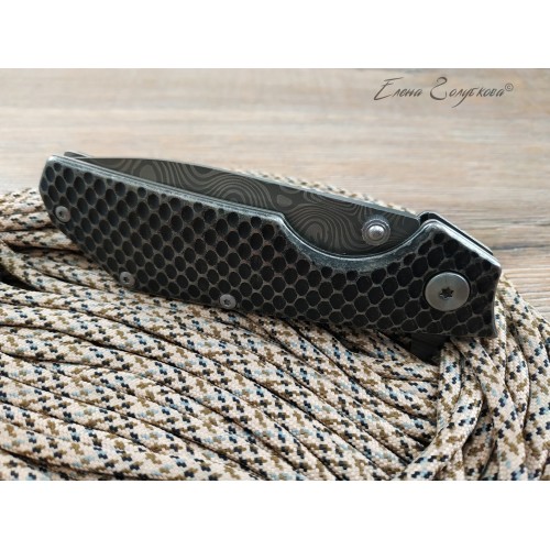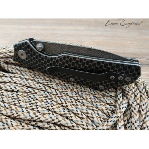 Клинок с обухом 2,9 мм, профиль Drop-Point, слабовогнутые спуски в половину ширины лезвия. Защитное покрытие клинка своим рисунком имитирует дамасскую сталь.