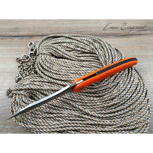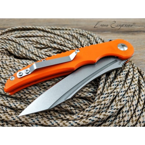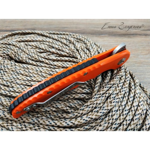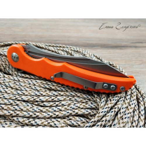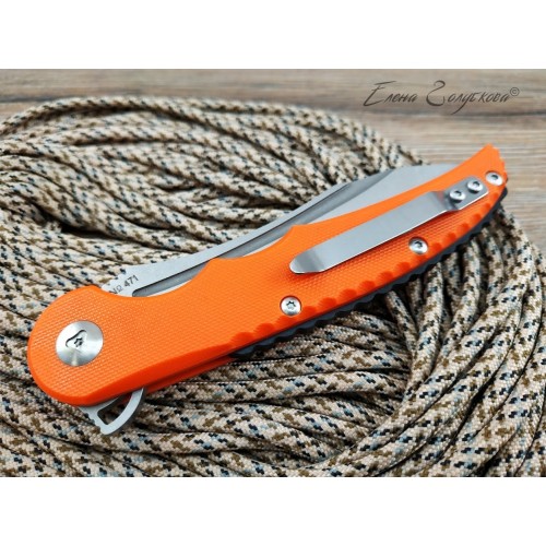 Насечки, выемки под пальцы и шероховатая поверхность рукояти не позволяют ножу скользить в руке и делают хват прочным и удобным. Текстолит G10, послуживший материалом для рукояти, без последствий перенесет любые условия. На одежде или снаряжении нож крепится при помощи клипсы, которая может быть установлена как с правой, так и с левой стороны рукояти.