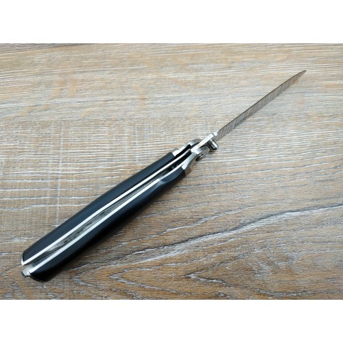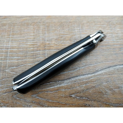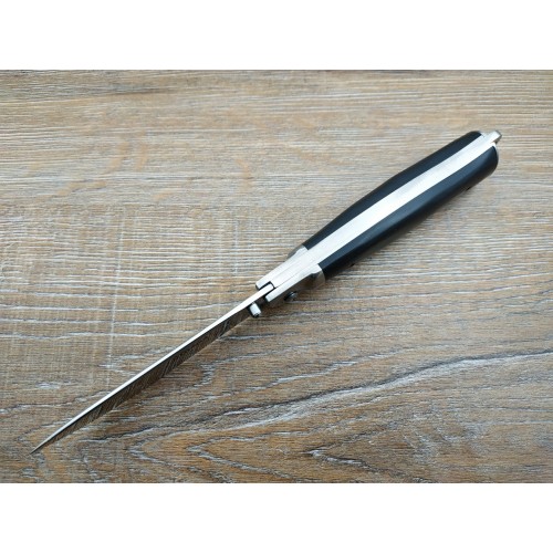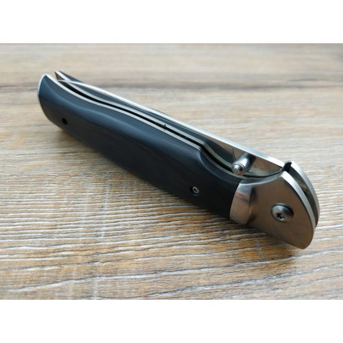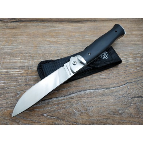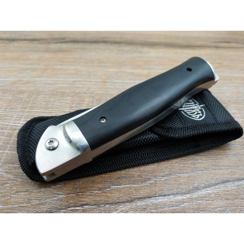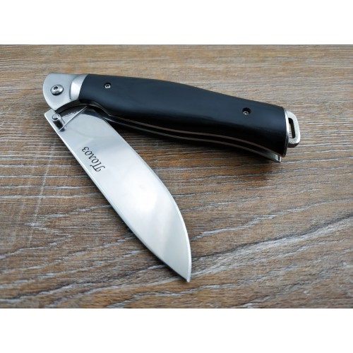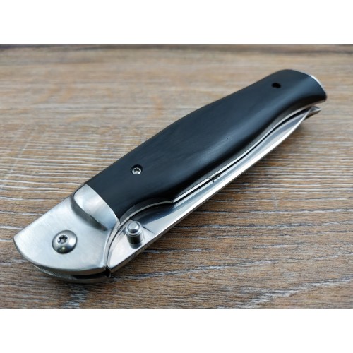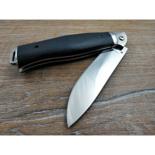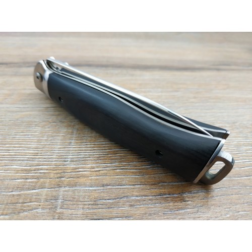Недорогой складной рабочий нож средних размеров с пухлой, практически круглой рукоятью, сформированной деревянными накладками. Прочная стальная петля на конце рукояти предназначена для темляка и может использоваться в качестве стеклобоя.