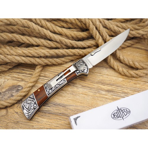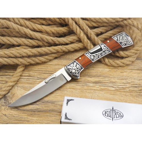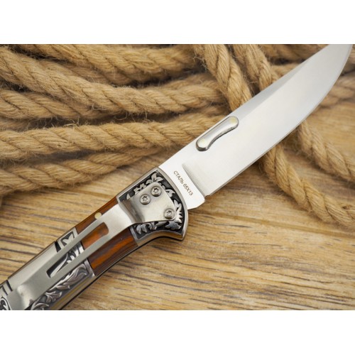 Классический "перочинный" нож - легкий, компактный и удобный. Клинок ножа, типа "normal-blade", изготовлен из нержавеющей стали, марки 65х13, и имеет достаточные характеристики для выполнения большинства повседневных задач. Извлечение клинка производится благодаря продолговатому шпеньку на обухе, а в качестве фиксатора выступает замок, типа "back-lock". Рукоять ножа металлическая, с накладками из композитного материала паккавуд. Больстер и навершие декорированы металлическими элементами с гравировкой. Для удобства использования на тыльнике ножа имеется  надежная клипса.