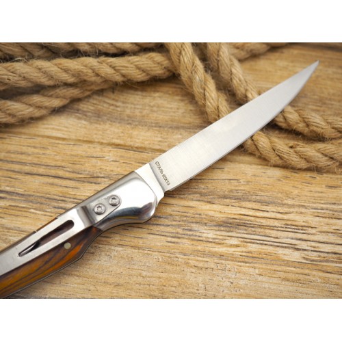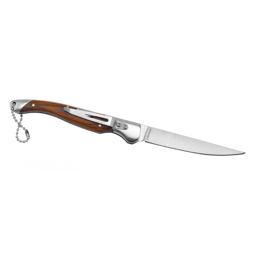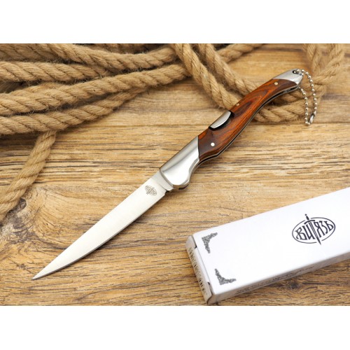 Классический "перочинный" нож - легкий, компактный и удобный. Клинок ножа, типа "normal-blade" изготовлен из нержавеющей стали, марки 65х13 и имеет достаточные характеристики для выполнения большинства повседневных задач. Извлечение клинка производится непосредственно за обух, а в качестве фиксатора выступает замок, типа "back-lock". Рукоять ножа металлическая, с накладками из композитного материала паккавуд. Для удобства использования на тыльнике ножа имеется темлячное отверстие, а также надежная клипса.