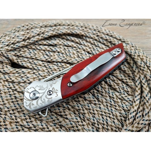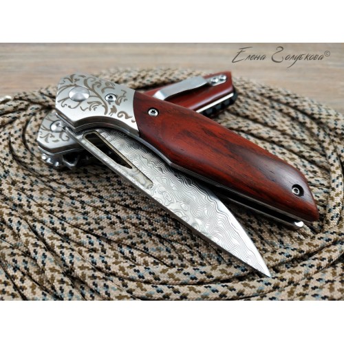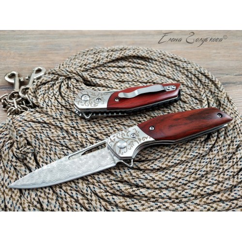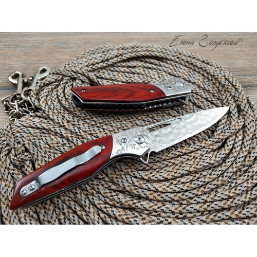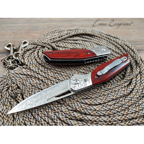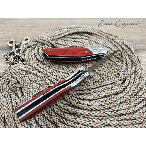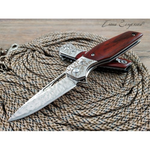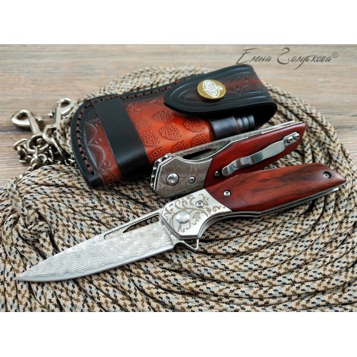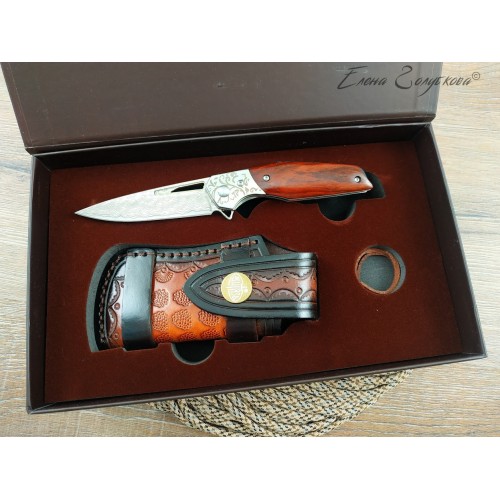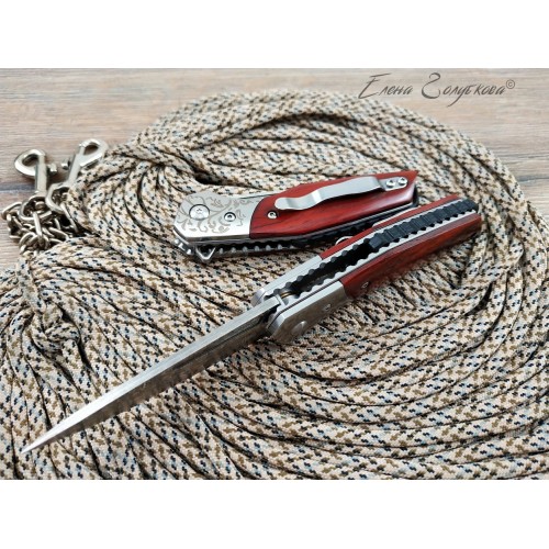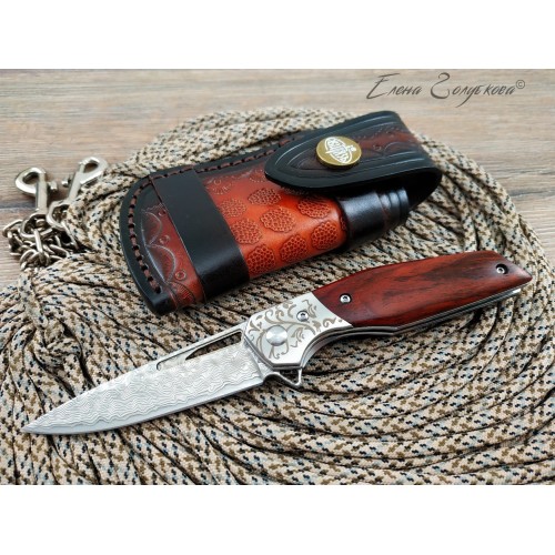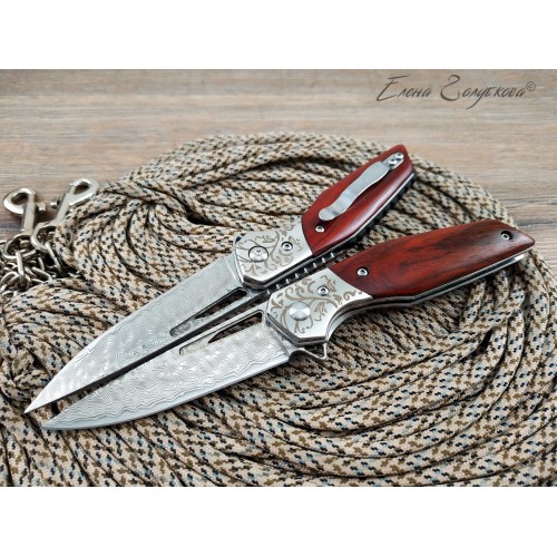 Складной нож Витязь дамаск B5298D. Изящный силуэт, прямой клинок, удобная рукоять. Он прекрасен своей строгой лаконичностью. Клинок изготовлен из многослойной дамасской стали и имеет характерный узор, так любимый ценителями ножей. Он легко справится с любыми задачами, которые могут возникнуть. Выступ на пяте клинка, предназначенный для открывания ножа, образует выраженный подпальцевый упор. Благодаря этому упору элегантная, слегка изогнутая рукоять надежно сидит в руке. Накладки из дерева венге со специальной пропиткой не боятся воды и отлично сочетаются с узором дамаска и стальным больстером. Замок типа Liner-Lock надёжно фиксирует открытый клинок. В комплекте подарочная коробка, изящный чехол из кожи с тиснением и кожаный темляк. Нож эффектно выглядит и может служить отличным подарком.