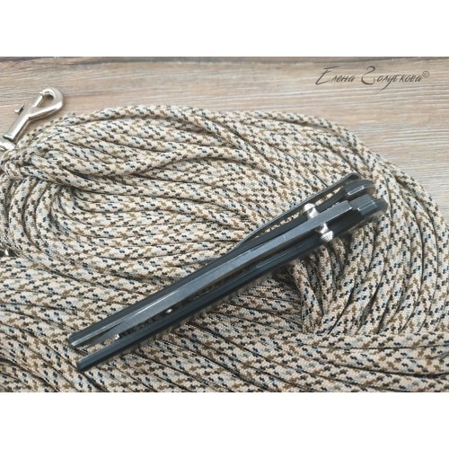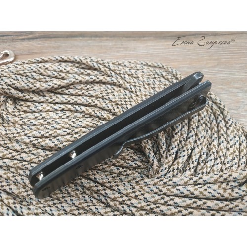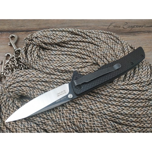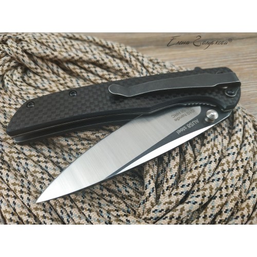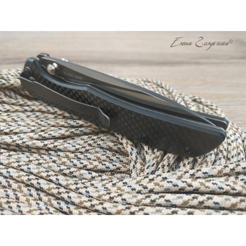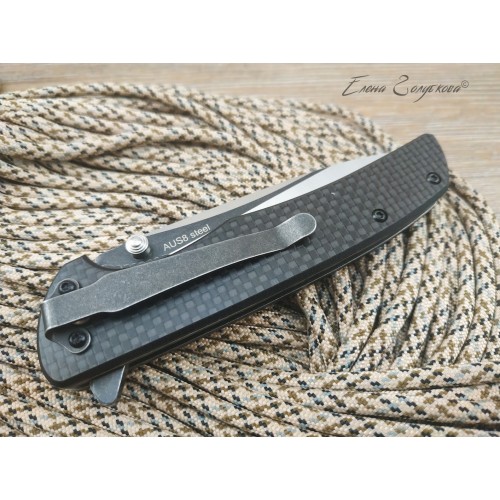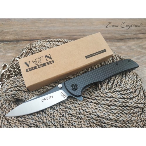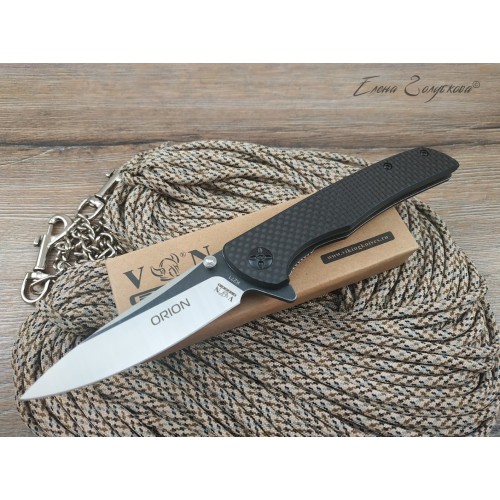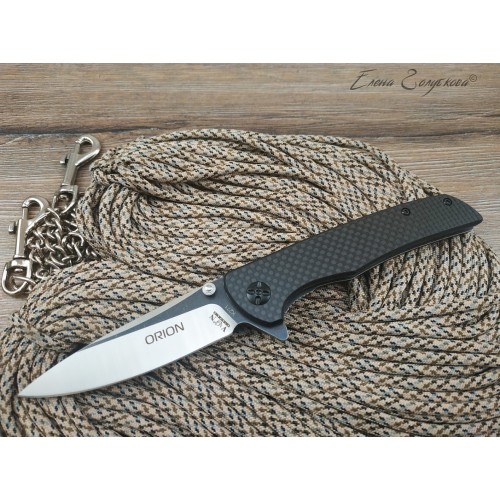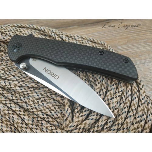ORION - складной нож с рукоятью из карбона. Клинок ножа смеет форму drop-point, с понижением обуха и изготовлен из высоколегированной порошковой стали AUS8 с фальшлезвием на обухе. Высокие прямые спуски дают ножу отличные режущие свойства, толщина клинка в 3,3 мм позволяет выполнять умеренные силовые работы, а благодаря форме клинка нож отлично колет. Для выполнения тонких и деликатных задач на пяте клинка имеется углубление - чойл, куда удобно ложиться указательный палец. Такой короткий хват делает нож очень легко управляемым. Осевой узел сделан на подшипниках, благодаря чему нож легко открывается одним движением пальца, без каких-либо усилий. Для удобства открывания на пяте клинка также имеется специальный выступ, называемый плавником или флиппером. В открытом состоянии флиппер образует с рукояткой хорошо развитую одностороннюю гарду, которая предохраняет руку от соскальзывания на лезвие клинка. В открытом положении клинок фиксируется надежным замком, образуемым одной из боковых пластин рукояти, так называемый Liner-Lock. Рукоять образована двумя стальными пластинами с накладками из карбона и прочного композита G10. Роль спенсера, спинки рукояти, выполняют две стальные втулки, к которым крепятся половинки рукояти. Для удобства ношения нож оснащен надежной клипсой и легко крепится на кармане или поясе.