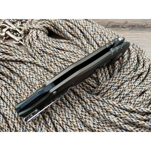 Лайнер замка frame-lock (фрейм-лок) стальной, прикрыт алюминиевой накладкой и вставкой из G10, за которую его удобно отжимать при складывании.