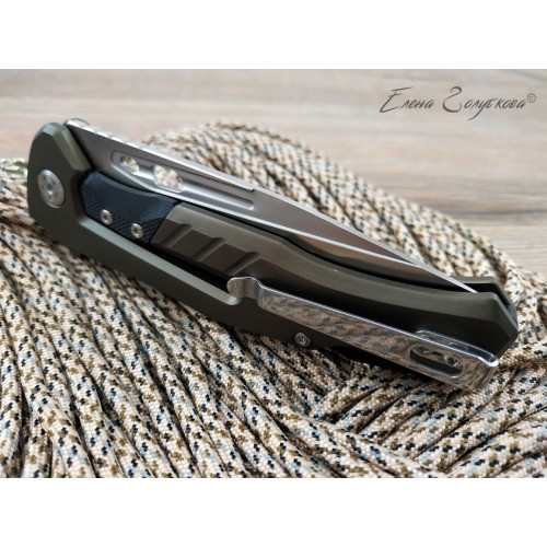 Конструкция рукояти – полуоткрытая, бэкспейсер с огромным темлячным отверстием из G10 прикрывает спинку на треть длины.