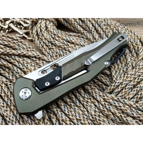 Несмотря на необычную форму лежит нож в руке удобно. Алюминиевая часть немного холодит, а текстурированные вставки из G10 не дают скользить в руке. Подпальцевый упор глубокий, его дополнительно увеличивает плавник флиппера.