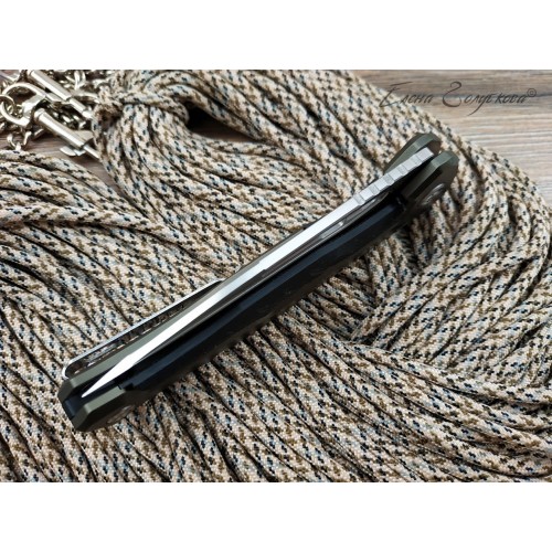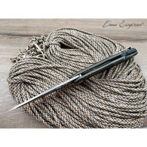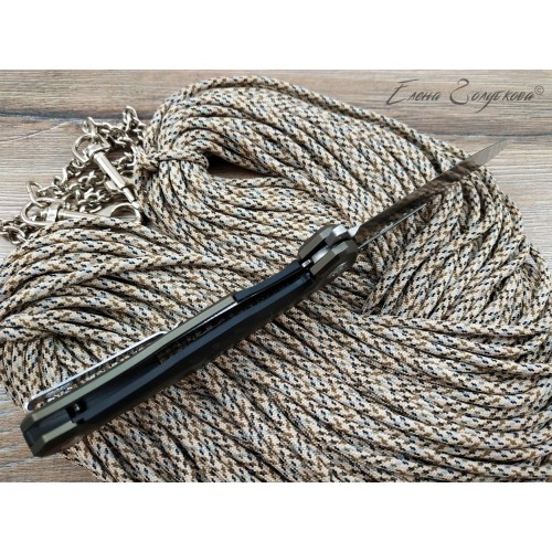 Поверхность клинка сатинирована. На клинке крупный логотип американской дизайнерской студии, марка стали – D2 – высокоуглеродистая полунержавеющая сталь, указана максимальная твердость – 61 HRC.
