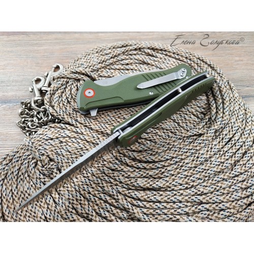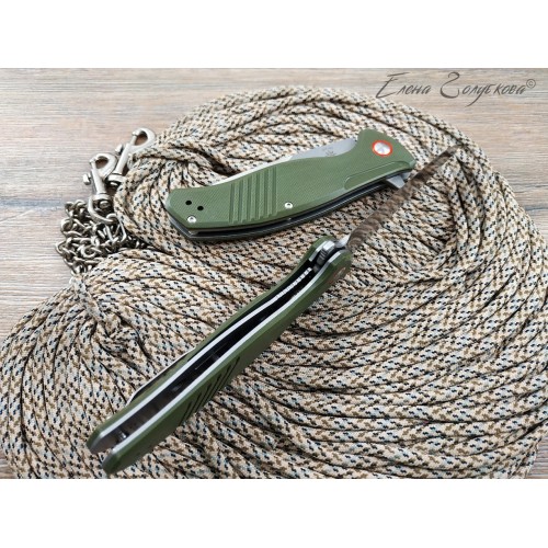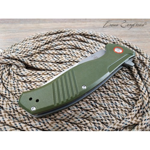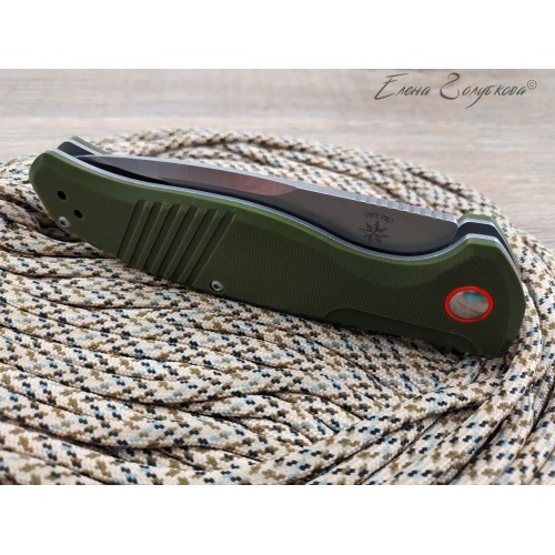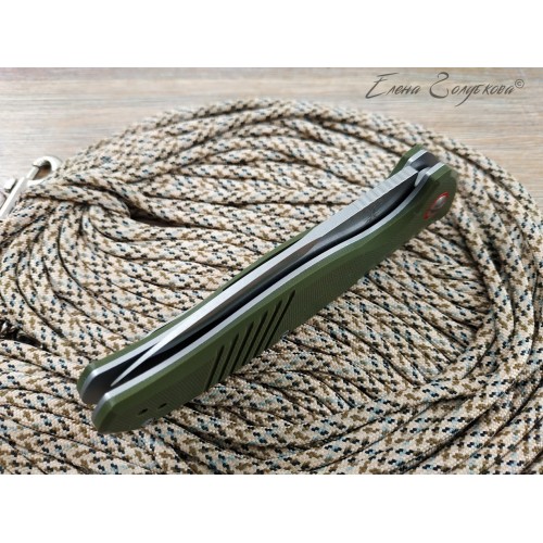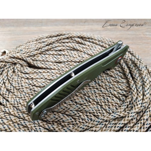 Рукоять собрана на стальных лайнерах (1,5 мм), соединенных осевым узлом и двумя бонками. Высокий плавник флиппера в раскрытом виде выполняет роль упора для руки. Рукоять большого размера, удобна под большую и среднюю руку. Накладки из стеклотекстолита G10 с мелкой насечкой обеспечивают надежный хват. G10 – очень прочный, устойчивый к нагрузкам и агрессивным средам материал, который практически не изнашивается и не выгорает, не боится воды.