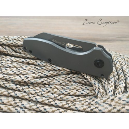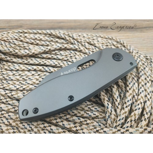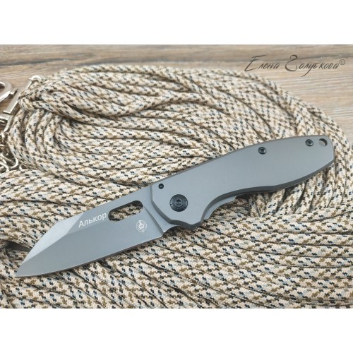Нож Алькор - не большой складной нож с фиксатором тапа frame-lock. Клинок ножа типа warnclife изготовлен из высококачественной нержавеющей стали, с достаточными для повседневных задач характеристиками. Нож легко открывается благодаря отверстию в клинке. Удобная стальная рукоять, так же как и клинок, имеет дополнительно серое титановое покрытие для большей коррозионной стойкости. Глубокая подпальцевая выемка обеспечивает достаточный уровень пезопастности при работе. Для удобства ношения нож оснащен клипсой.