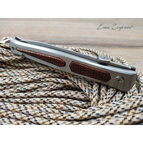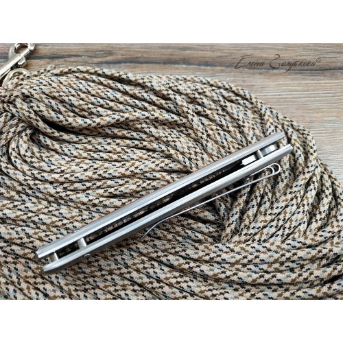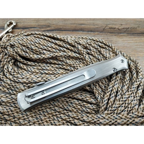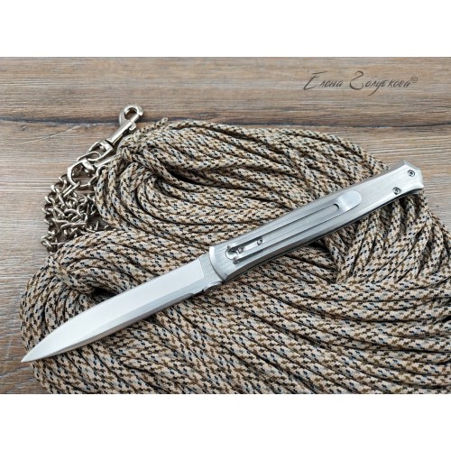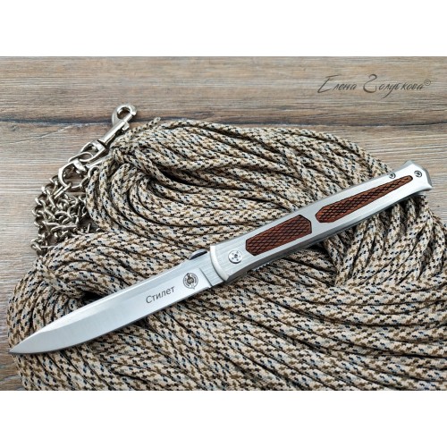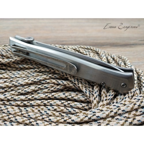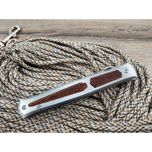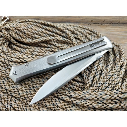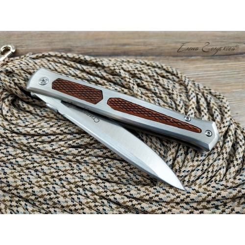 Изящный сладной нож. Узкий, длинный клинок, тонкая, веретенообразная рукоять роднят этот фолдер с грозным холодным оружием. Клинок ножа изготовлен из нержавеющей стали марки 440, имеет хороший баланс между твердостью, стойкостью к коррозии и легкостью заточки. Для открывания ножа на обухе клинка сделана специальная "таблетка", удобная для использования как правой, так и левой рукой. В раскрытом положении нож фиксируется замком типа liner-lock, который предохраняет нож от случайного складывания, а руку от связанной с этим травмы. Рукоять ножа полностью изготовлена из стали, с не большими деревянными вставками и жесткой клипсой.