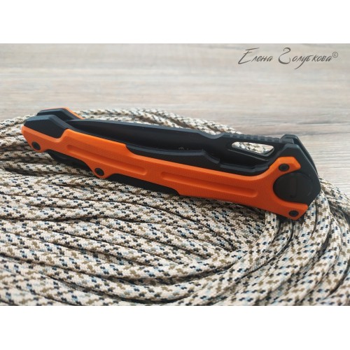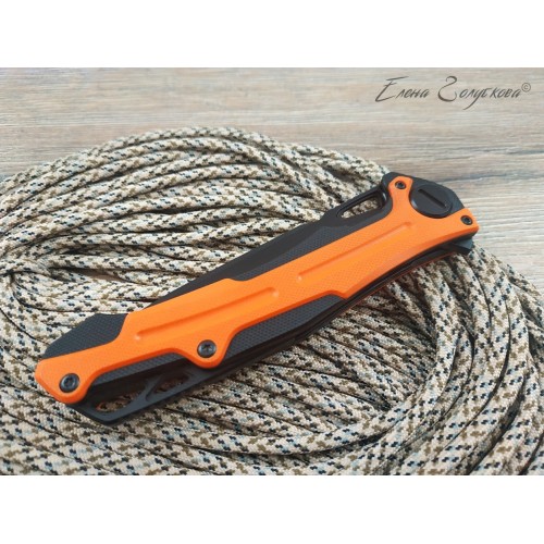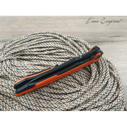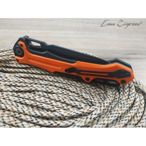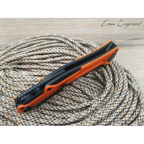 Современный дизайн ножа в техно-стиле, заданный элегантным клинком, продолжает рукоять. Она образована двухслойными текстурированными накладками из G10, материала, который отличается долговечностью, устойчив к механическим повреждениям и температурным воздействиям. В зависимости от варианта исполнения G10 комбинируется со стальными лайнерами или лайнерами и проставкой из карбона. Замок типа Liner-Lock с запирающей пластиной толщиной 2 мм обеспечивает надежную фиксацию клинка. Отметим, что рукоять немного удлинена для комфортной работы в перчатках. Дополнительную жесткость и прочность рукояти придает проставка-спейсер из G10, в задней части которой имеется двойное темлячное отверстие, что открывает дополнительные возможности по креплению темляков, страховочных шнуров или тренчиков.