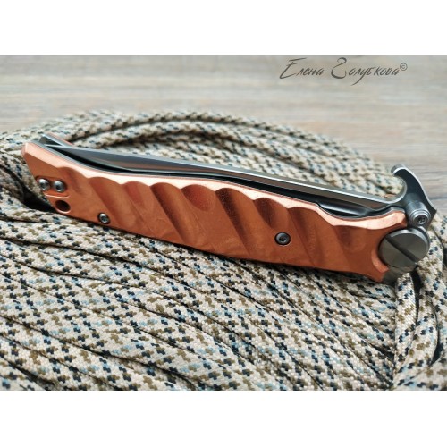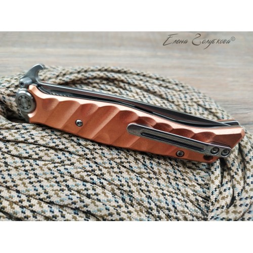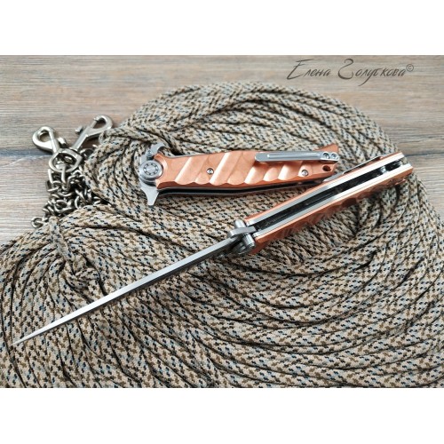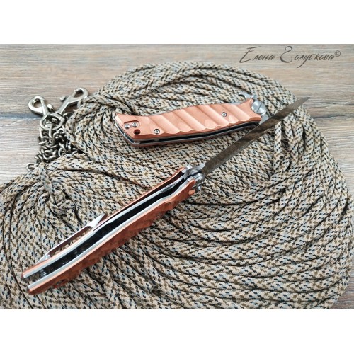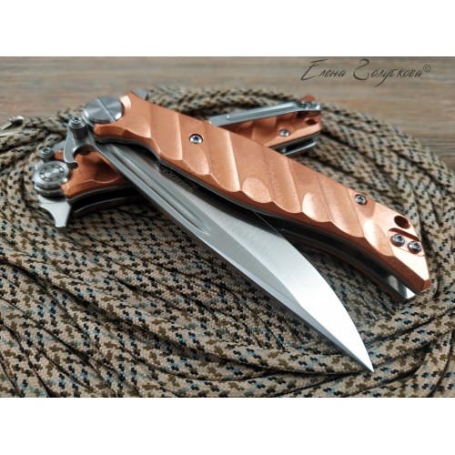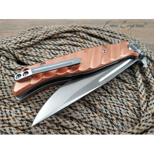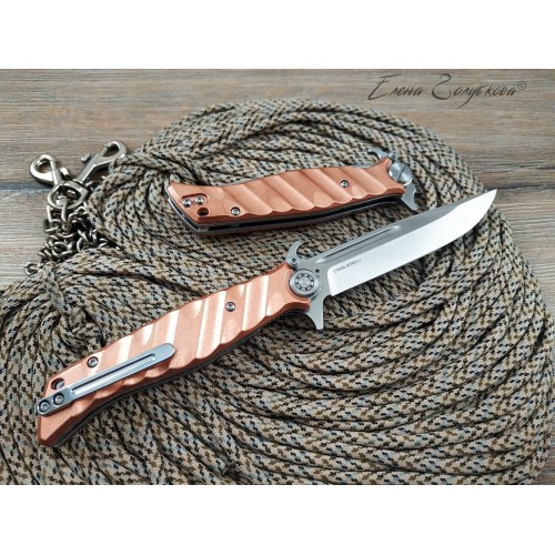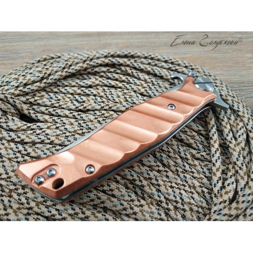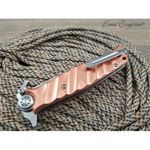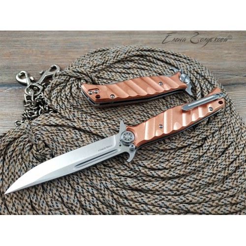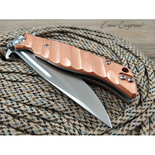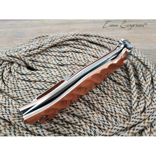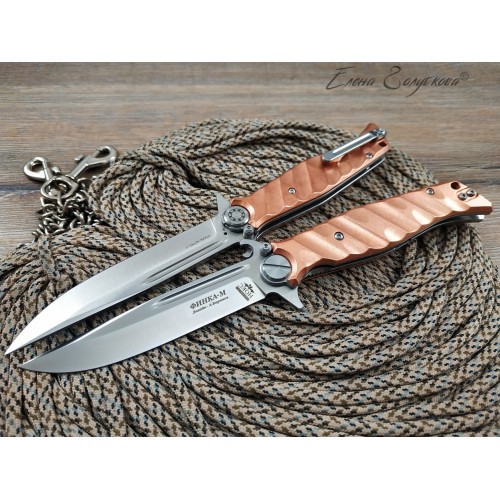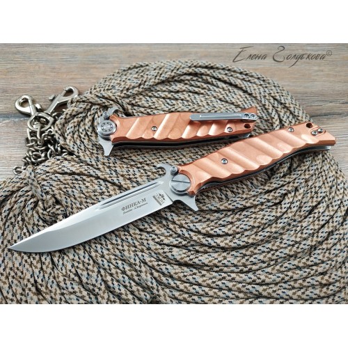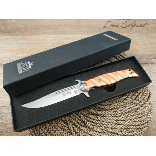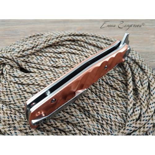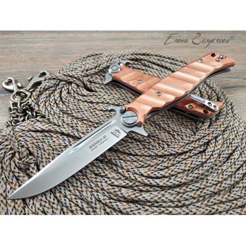 Складной нож Финка М Red Cupper (348-130006) Нокс – это продолжение полюбившегося ножа Финка С. От базовой модели новинка отличается уменьшенными размерами, переставляемой фрезерованной клипсой, отсутствием спейсера. По-прежнему, эффективный клинок, изящно переходит в двустороннюю гарду. И конечно на ноже присутствует инновационно вписанный в рукоять предохранитель типа "Lawks", надёжно уберегающий от самопроизвольного закрытия. Для любителей стиля «металлик» на данной модели установлены брутальные накладки из высококачественной меди. Более легкое и комфортное открывания клинка осевой узел оборудован двухрядными керамическими подшипниками.