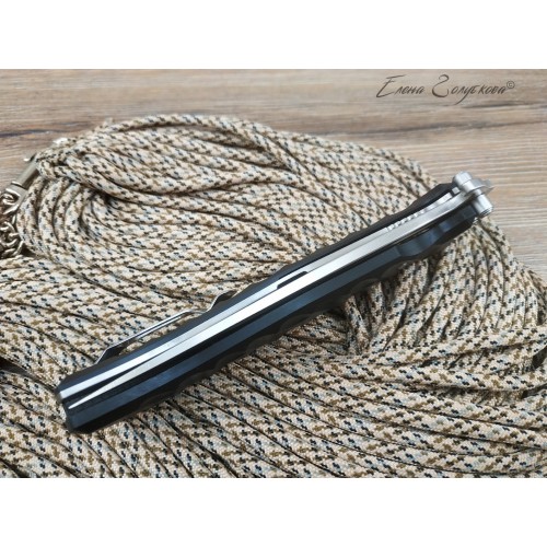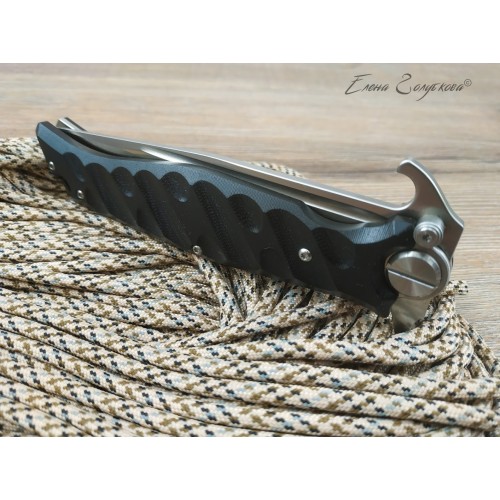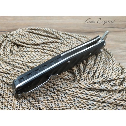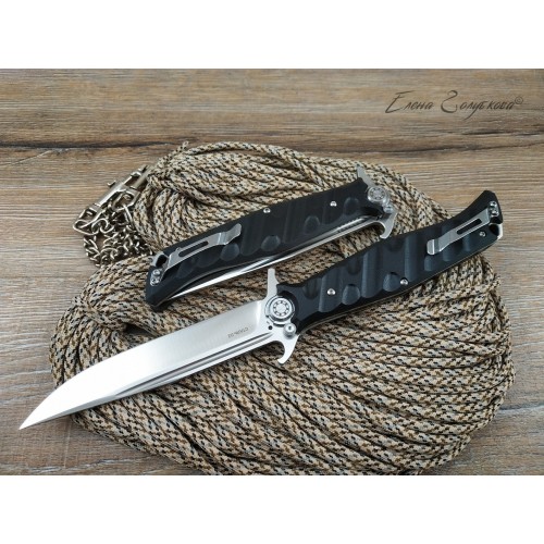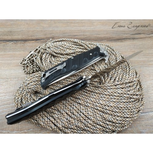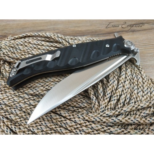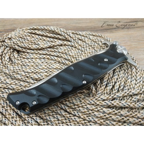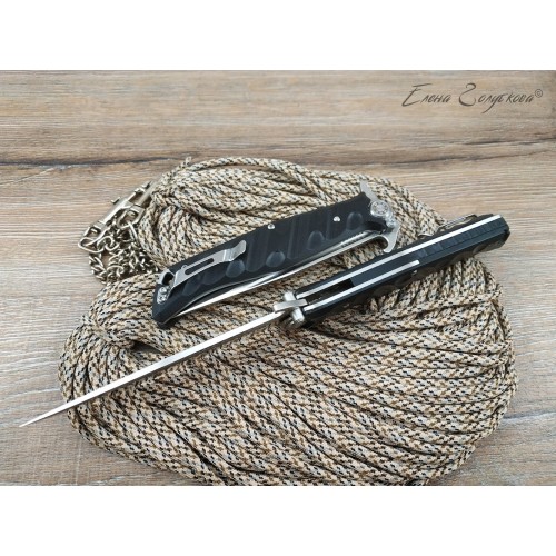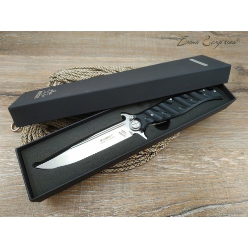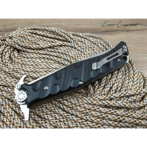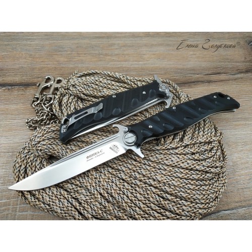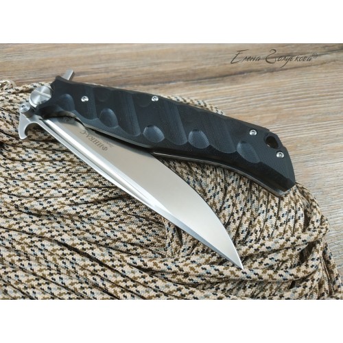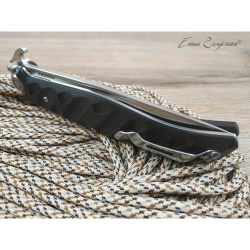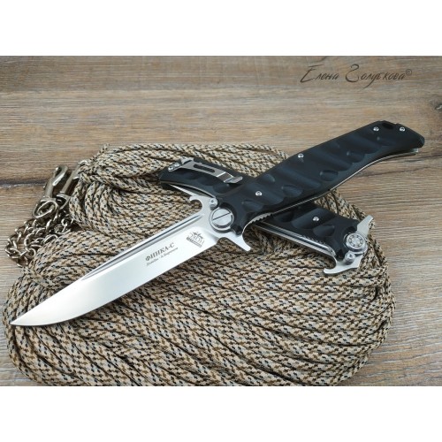Уникальная особенность конструкции новой «Финки» - инновационно вписанный в мощный осевой узел модифицированный предохранитель «скрытого» типа, «Lawks», гарантирующий от самопроизвольного закрытия клинка, выполненного из легированной инструментальной стали D2, которая отличается твердостью (60 – 61 HRC), устойчивостью к механическим повреждениям и отлично держит заточку. Обработка клинка – сатинирование, упорный шпенек на фиксаторе резьбы. Накладки из высокопрочного пластика G10 черного цвета с трехмерным рельефом поверхности обеспечивают надежный и комфортный хват.