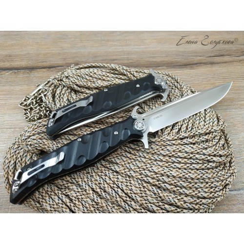 Длинный хищный клинок классической формы "Clip-Point" украшен узкими долами, имеет высокие плоские спуски и изящно переходит в двустороннюю гарду. При этом нижняя ветвь упора исполняет функцию плавника-«флиппера», а верхняя одновременно является «вэйвом», который позволяет мгновенно открыть нож при извлечении из кармана, С учетом того, что осевой узел ножа собран на подшипниках, такой способ открывания клинка является мгновенным.