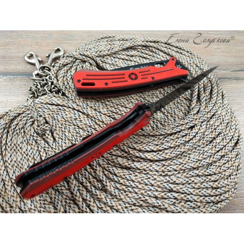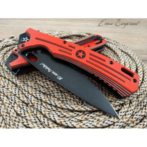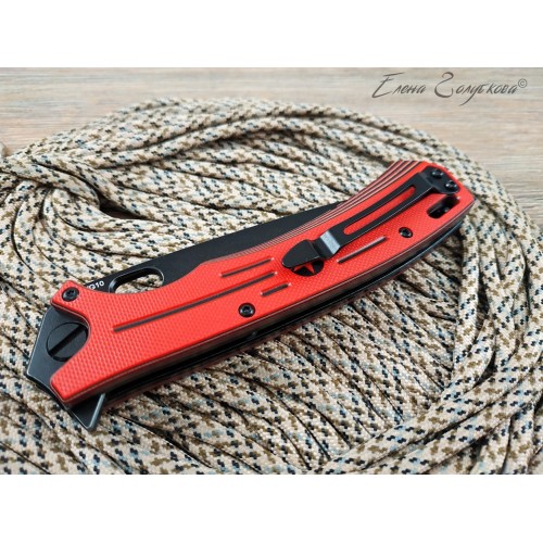 Складной нож Майор Нокс - это настоящий современный складной тактический нож, который одновременно прекрасно подходит на роль EDC – ножа постоянного ношения. В нем соединены самые современные материалы, лаконичный стильный дизайн и удачные конструктивные решения. Нож имеет рукоять эргономически выгодной формы с рифлеными не скользящими накладками из черного сверхпрочного пластика G10 и обеспечивает цепкое удержание ножа даже в мокрой руке. Сравнительно длинный и прочный клинок с высокими плоскими спусками имеет идеальный для реза строй – так называемый «тройной клин». А его игольно-острый кончик обладает превосходными проникающими свойствами. Овальное отверстие в клинке служит удобного для открывания одной рукой – не важно, левой или правой и, в отличие от шпеньков, не отнимает ни миллиметра эффективной длины клинка. Так же нож может открываться и инерционным способом, за выступ-флиппер, который в открытом положении эффективно исполняет роль гарды - упора. С учетом того, что осевой узел ножа собран на специальных подшипниках, такой способ открывания клинка почти мгновенен, что очень важно при использовании ножа в экстремальной ситуации, но притом намного проще и надежнее автоматических пружинных механизмов. В сочетании с тем, что прочный замок типа «лайнер-лок» надежно гарантирует нож от несанкционированного складывания даже при силовой работе, это делает "Майора" эффективным средством самообороны и одновременно удобным инструментом. В задней части рукоятки расположена упругая стальная клипса и отверстие под темляк. Вся конструкция прочно собрана на упорных бонках и позволяет легко промывать и чистить нож. Лайнеры облегчены отверстиями.