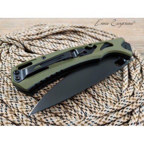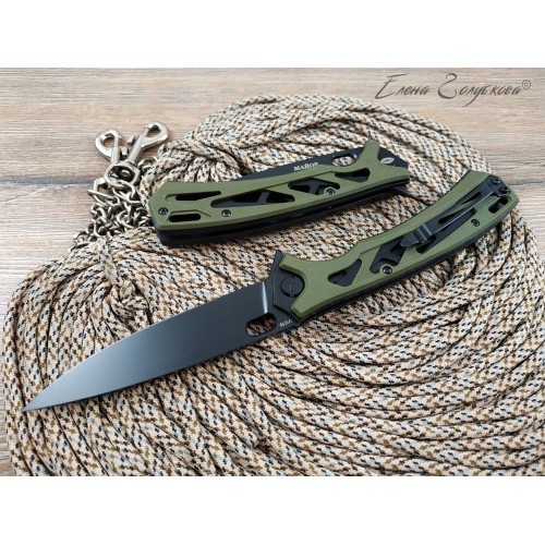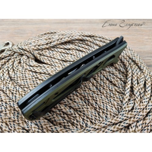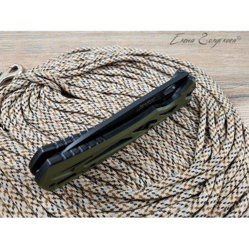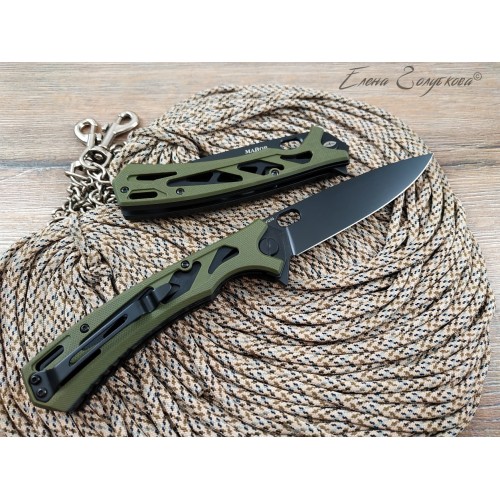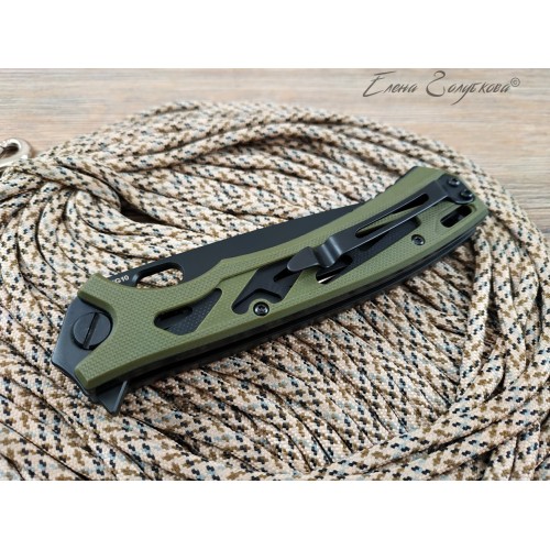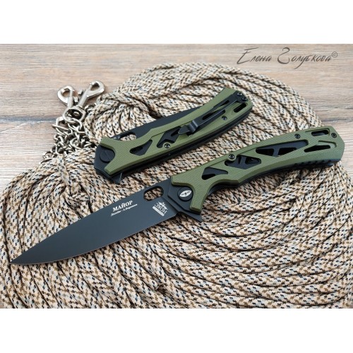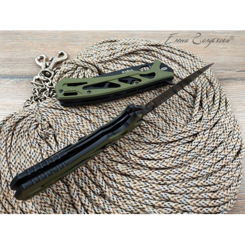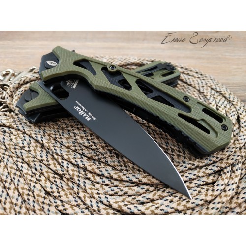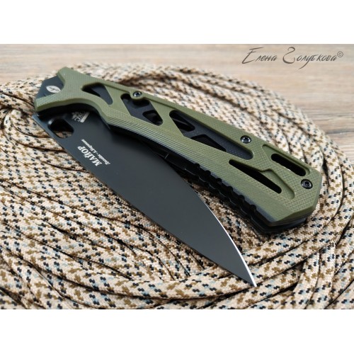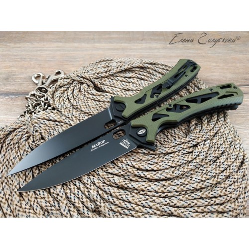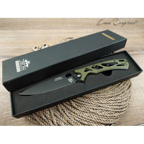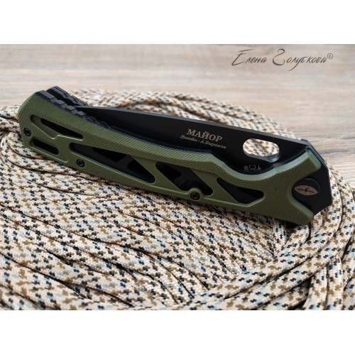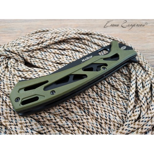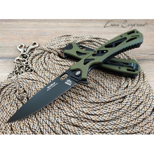 Складной нож Майор Нокс - это настоящий современный складной тактический нож, который одновременно прекрасно подходит на роль EDC – ножа постоянного ношения. В нем соединены самые современные материалы, лаконичный стильный дизайн и удачные конструктивные решения. Нож имеет рукоять эргономически выгодной формы с рифлеными не скользящими накладками из черного сверхпрочного пластика G10 и обеспечивает цепкое удержание ножа даже в мокрой руке. Сравнительно длинный и прочный клинок с высокими плоскими спусками имеет идеальный для реза строй – так называемый «тройной клин». А его игольно-острый кончик обладает превосходными проникающими свойствами. Овальное отверстие в клинке служит удобного для открывания одной рукой – не важно, левой или правой и, в отличие от шпеньков, не отнимает ни миллиметра эффективной длины клинка. Так же нож может открываться и инерционным способом, за выступ-флиппер, который в открытом положении эффективно исполняет роль гарды - упора. С учетом того, что осевой узел ножа собран на специальных подшипниках, такой способ открывания клинка почти мгновенен, что очень важно при использовании ножа в экстремальной ситуации, но притом намного проще и надежнее автоматических пружинных механизмов. В сочетании с тем, что прочный замок типа «лайнер-лок» надежно гарантирует нож от несанкционированного складывания даже при силовой работе, это делает "Майора" эффективным средством самообороны и одновременно удобным инструментом. В задней части рукоятки расположена упругая стальная клипса и отверстие под темляк. Вся конструкция прочно собрана на упорных бонках и позволяет легко промывать и чистить нож. Лайнеры облегчены отверстиями.