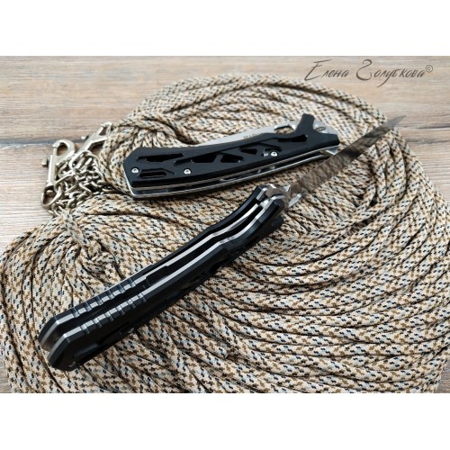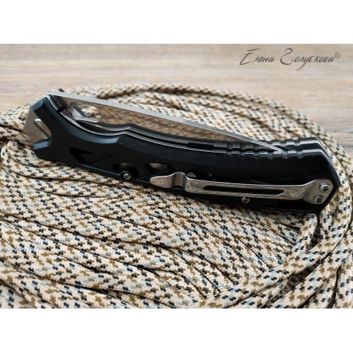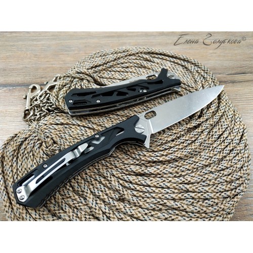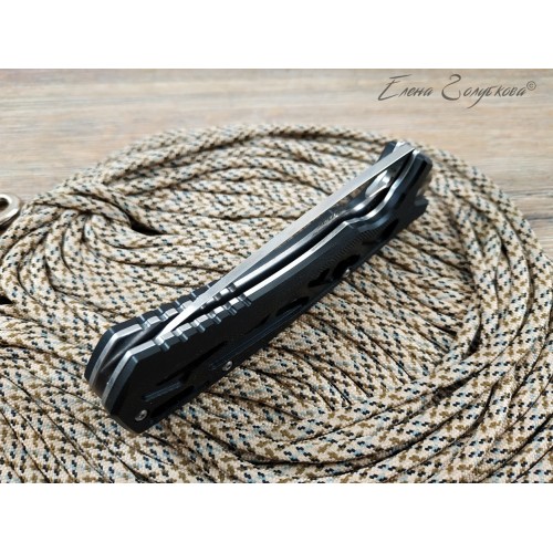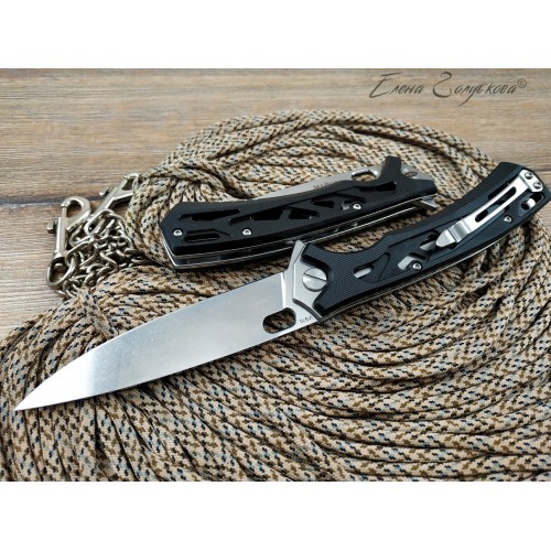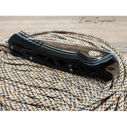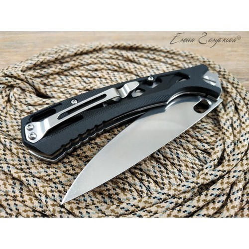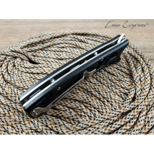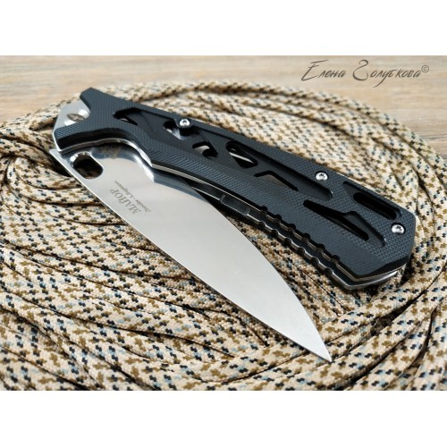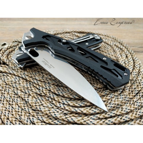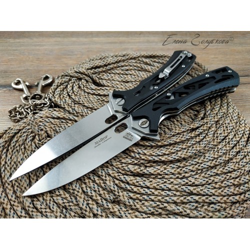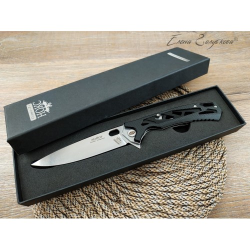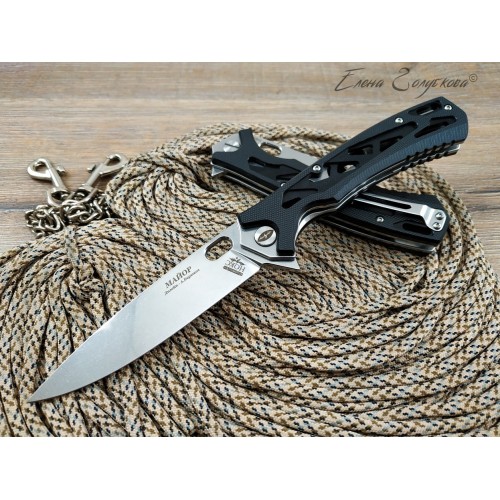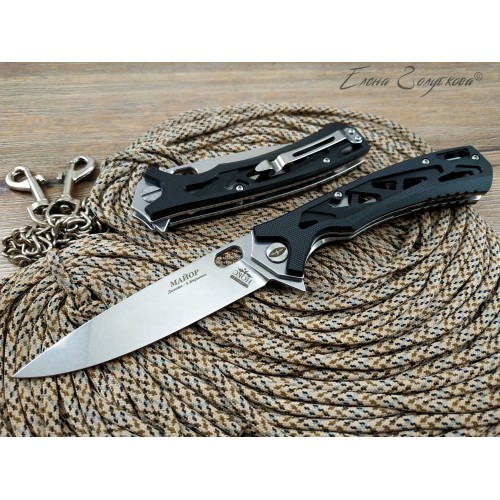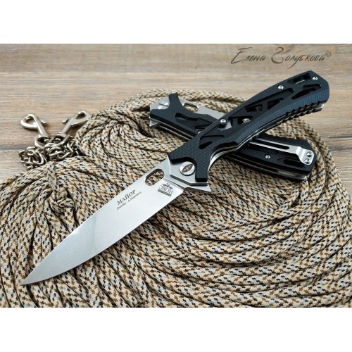 Складной нож Майор Нокс - это настоящий современный складной тактический нож, который одновременно прекрасно подходит на роль EDC – ножа постоянного ношения. В нем соединены самые современные материалы, лаконичный стильный дизайн и удачные конструктивные решения. Нож имеет рукоять эргономически выгодной формы с рифлеными не скользящими накладками из черного сверхпрочного пластика G10 и обеспечивает цепкое удержание ножа даже в мокрой руке. Сравнительно длинный и прочный клинок с высокими плоскими спусками имеет идеальный для реза строй – так называемый «тройной клин». А его игольно-острый кончик обладает превосходными проникающими свойствами. Овальное отверстие в клинке служит удобного для открывания одной рукой – не важно, левой или правой и, в отличие от шпеньков, не отнимает ни миллиметра эффективной длины клинка. Так же нож может открываться и инерционным способом, за выступ-флиппер, который в открытом положении эффективно исполняет роль гарды - упора. С учетом того, что осевой узел ножа собран на специальных подшипниках, такой способ открывания клинка почти мгновенен, что очень важно при использовании ножа в экстремальной ситуации, но притом намного проще и надежнее автоматических пружинных механизмов. В сочетании с тем, что прочный замок типа «лайнер-лок» надежно гарантирует нож от несанкционированного складывания даже при силовой работе, это делает "Майора" эффективным средством самообороны и одновременно удобным инструментом. В задней части рукоятки расположена упругая стальная клипса и отверстие под темляк. Вся конструкция прочно собрана на упорных бонках и позволяет легко промывать и чистить нож. Лайнеры облегчены отверстиями. Металлические части ножа сатинированы.