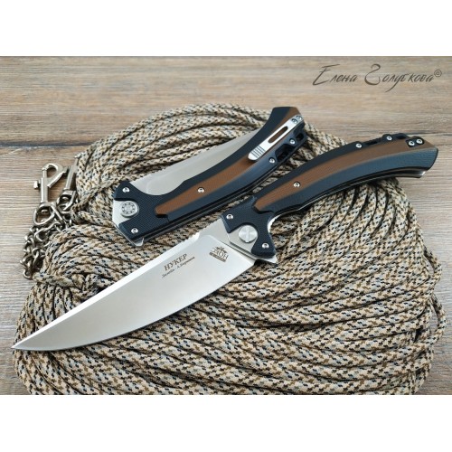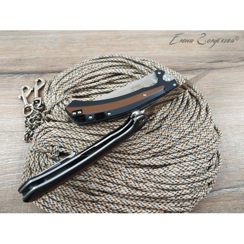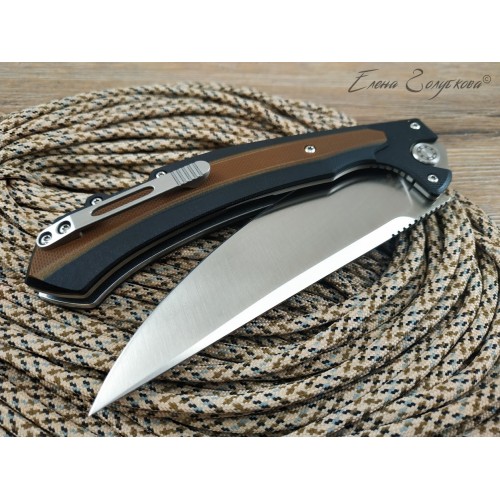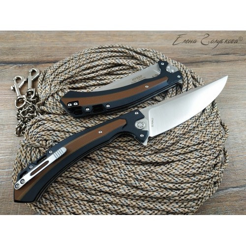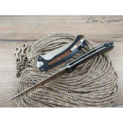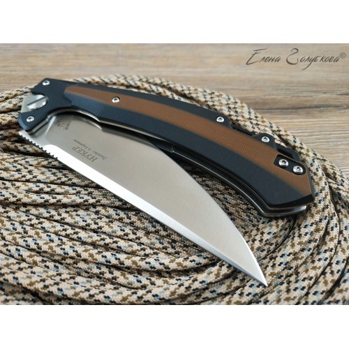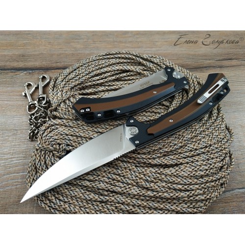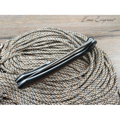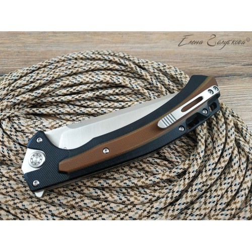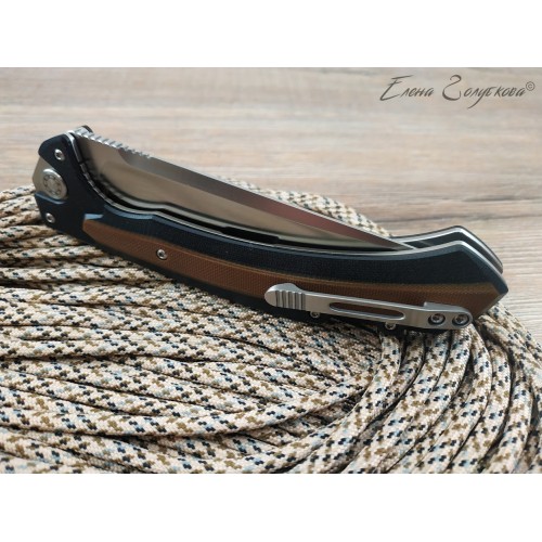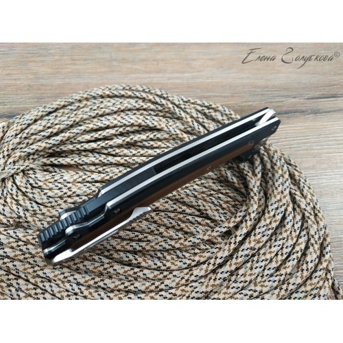 Эргономичная рукоять из прочного материала G10 устойчива к любым воздействиям, прекрасно лежит в ладони, выдерживает существенные нагрузки. Глубокая подпальцевая выемка на её нижней части переходит в развитый упор, и надежно защищает руку от контакта с клинком, который в открытом положении надежно фиксируется замком типа «лайнер-лок».