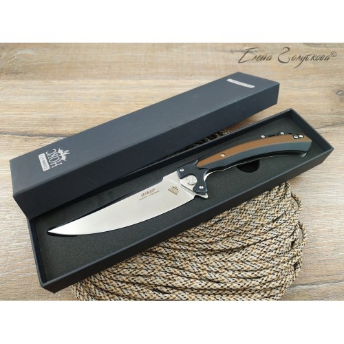 Клинок с прямым обухом и плавным подъёмом лезвия к острию, прямыми высокими спусками производится из высококачественной, легированной стали D2 ( с твердостью 60 – 61 HRC) - отлично подходит для выполнения различных задач, и главным его назначением будет точный и контролируемый рез.