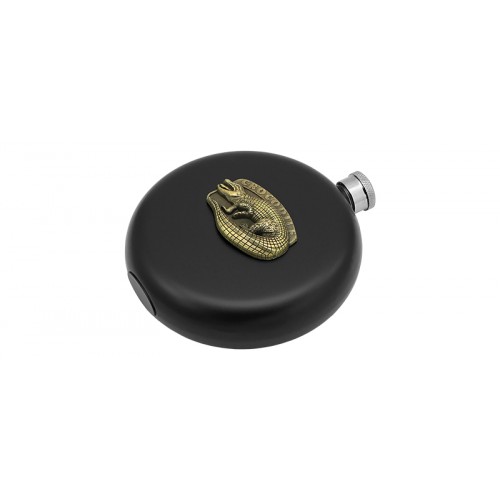 Карманная фляга черного цвета из пищевой нержавеющей стали для спиртных напитков или воды емкостью 220 мл. Фляга декорирована барельефом с изображением крокодила. Благодаря круглой форме фляга удобно помешается во внутренний карман одежды и не выделяется при ношении.
